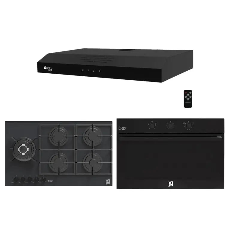 بوتاجاز بلت إن غاز بيورتي 90 سم زجاج أسود – 5 شعلات SABAF – إشعال أوتوماتيك – HPT912G + بيورتي ـ فرن بلت إن غاز بشواية غاز 90 سم أسود 97 لتر OPT903GG + شفاط بلت إن 90 سم مسطح أسود من بيورتي قوة شفط 450 م3/ساعة موديل PTSLIM PLUS 90 BL