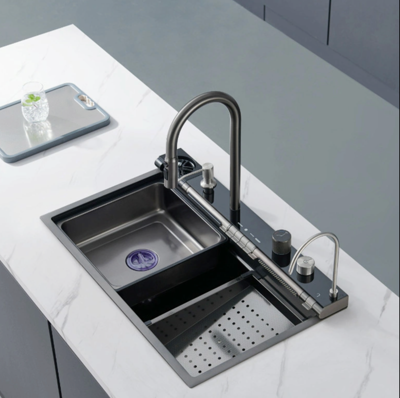 حوض مطبخ سمارت ديجيتال 7 ازرار بخلاط شداد 3 نظام و 2 خلاط شلال بحنفية فلتر بالصرف 3 بوصة اللون رمادى