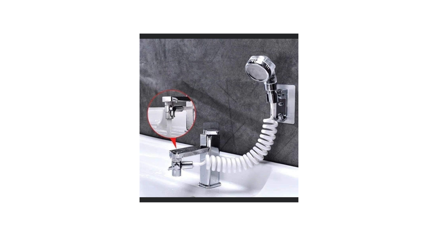 وصلة شاور للخلاط مع خرطوم حلزوني متحرك ورأس دش محمول. هذا النوع من الوصلات يستخدم لتحويل تدفق المياه بين الصنبور والدش بسهولة، وهو مناسب للمغاسل أو الحمامات.